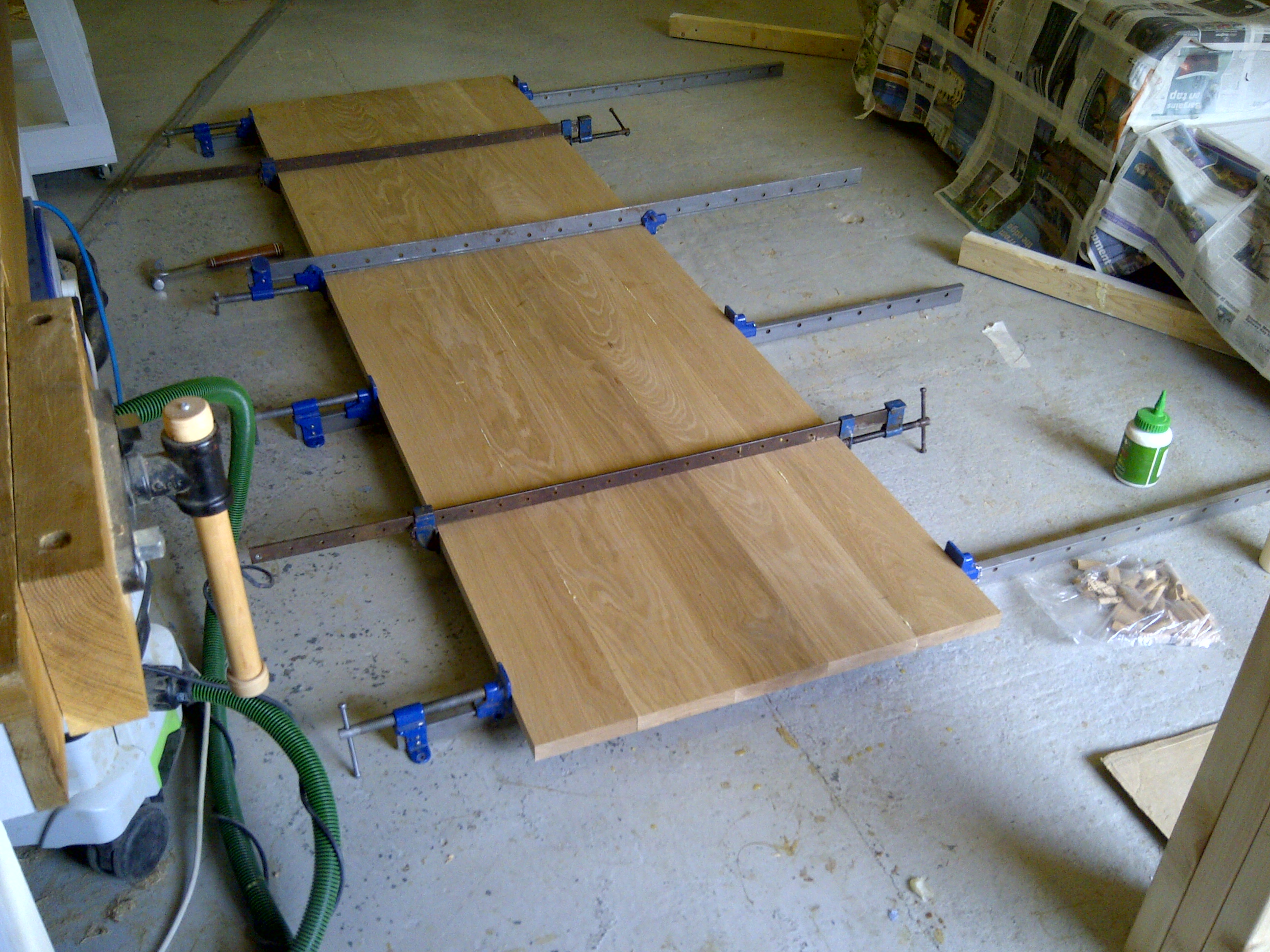The first job was to make the panels by joining the oak boards edge-on-edge. There are never enough clamps.