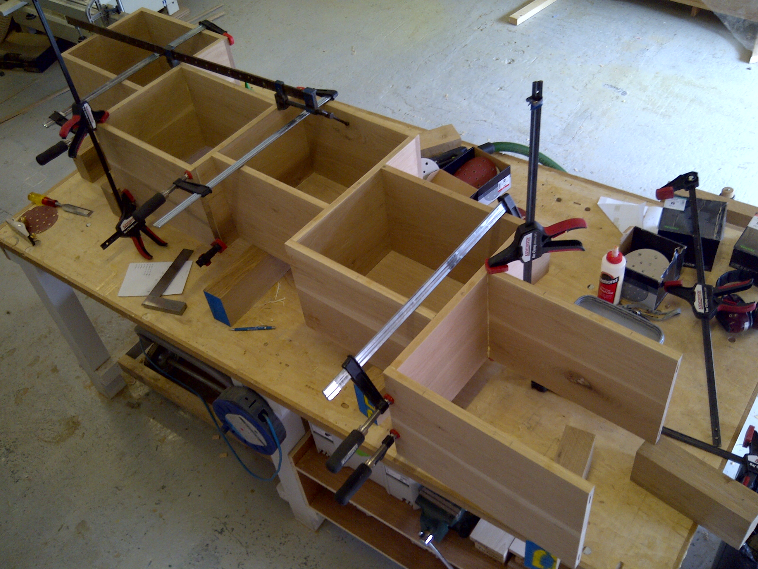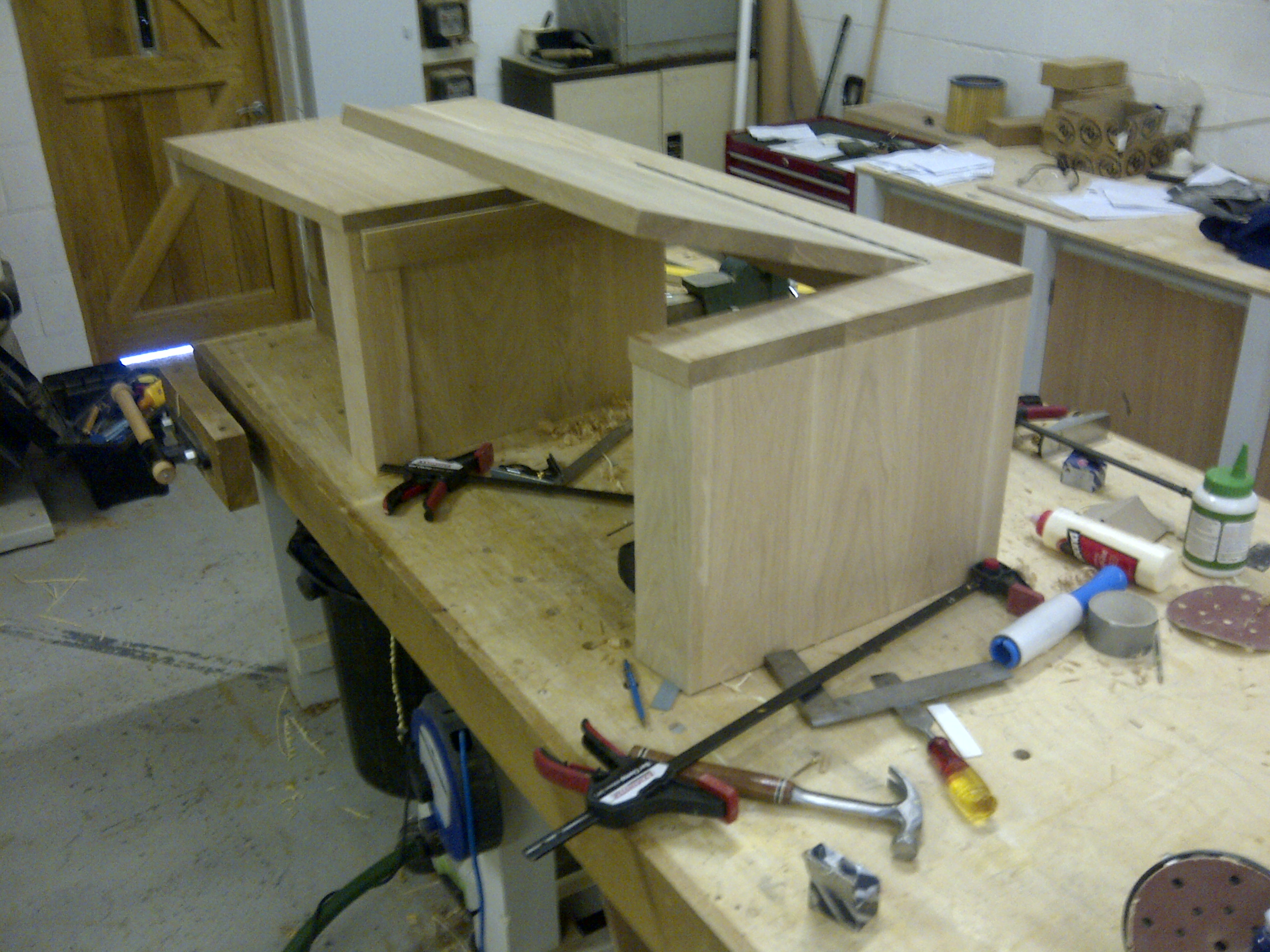 The stepped upper cabinet’s were quite a challenge to join and glue because there were so many bits which needed to be kept square. A lot of the components also had to be clamped in order to ensure a tight joint, so I split the assembly into three sections. The photo below is of the final glue-up stage where everything comes together.