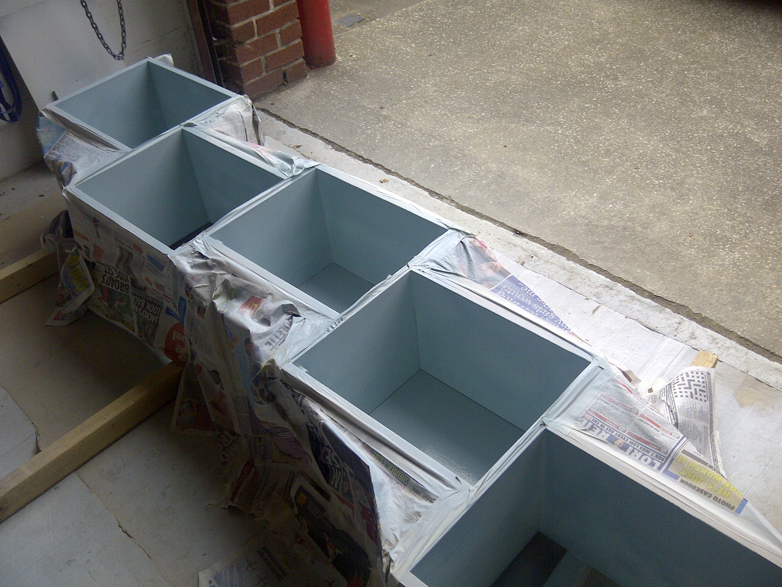 The inside of the stepped cabinets were painted duck-egg blue. I sprayed about five thin coats. It’s much better to do lots of thin coats rather than fewer thick ones, as it avoids drips and imperfections in the paintwork.