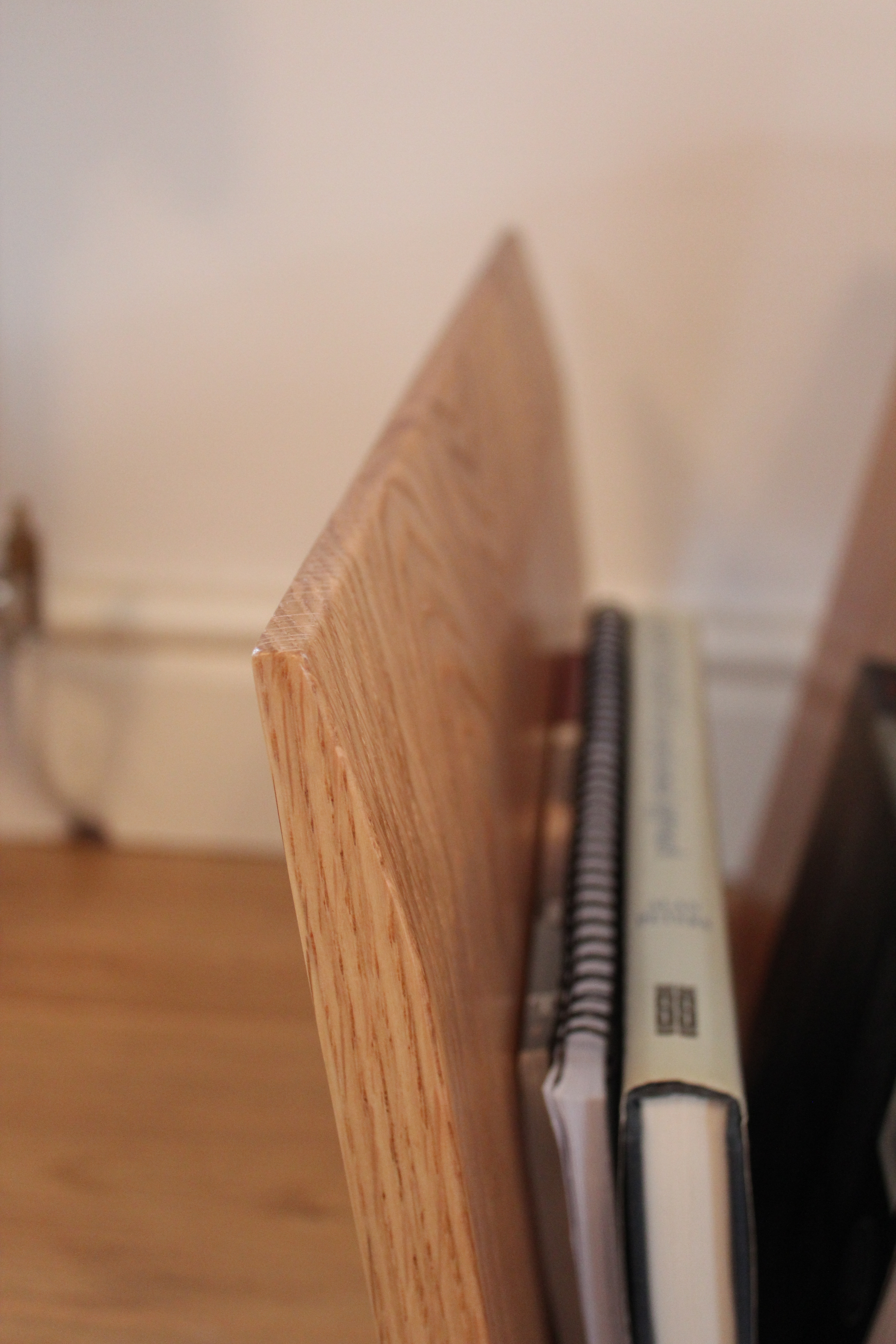 The design for the coffee table is a lot more simple than the desk, and consists of a single folded band of oak which wraps around to create the hollow leg at one end and a magazine rack at the other.